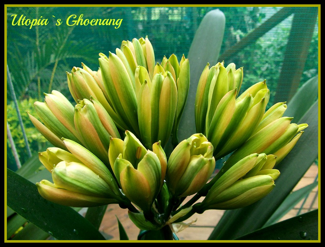 Ghoenang is another example of a rare find in a South African garden. They are not easily pollinated due to the fact that the flowers only open slightly, if at all. Tana`s Green is another find out of a local garden and is really an unusual flower with lots of white, green and brick colouring.