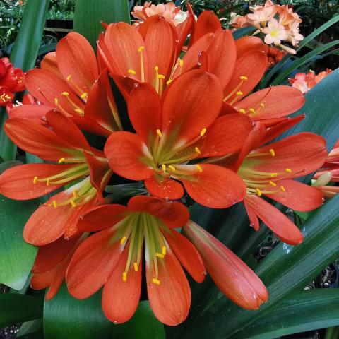 ROBUSTA:Clivia robusta in general occurs in the more marshy or swampy sections of our country. Plants are usually between 1200 and 1800 mm in height, with 10-20 light green leaves .These leaves are between 40 to 125 mm wide and 1200 to 1800 mm long, narrowing to a slightly rounded point. The orange-red pendulous flowers with pronounced green tips vary in colours from baby pink to deep red and are similar to Clivia gardenii . Yellow, yellow to peach and apricot forms do occur occasionally. The flowering season is from May to July, with some plants already setting seed while new buds are forming.