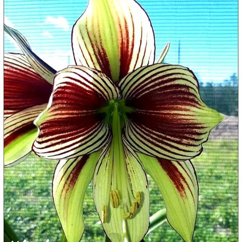 (Butterfly Amaryllis) has striking blooms of maroon, bronze and cream on dark-green foliage. This rare variety of hippeastrum, is slow-growing and evergreen.