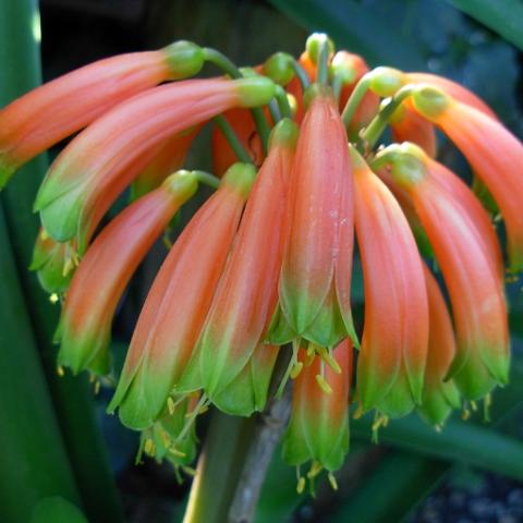 ROBUSTA:Clivia robusta in general occurs in the more marshy or swampy sections of our country. Plants are usually between 1200 and 1800 mm in height, with 10-20 light green leaves .These leaves are between 40 to 125 mm wide and 1200 to 1800 mm long, narrowing to a slightly rounded point. The orange-red pendulous flowers with pronounced green tips vary in colours from baby pink to deep red and are similar to Clivia gardenii . Yellow, yellow to peach and apricot forms do occur occasionally. The flowering season is from May to July, with some plants already setting seed while new buds are forming.
