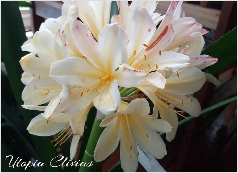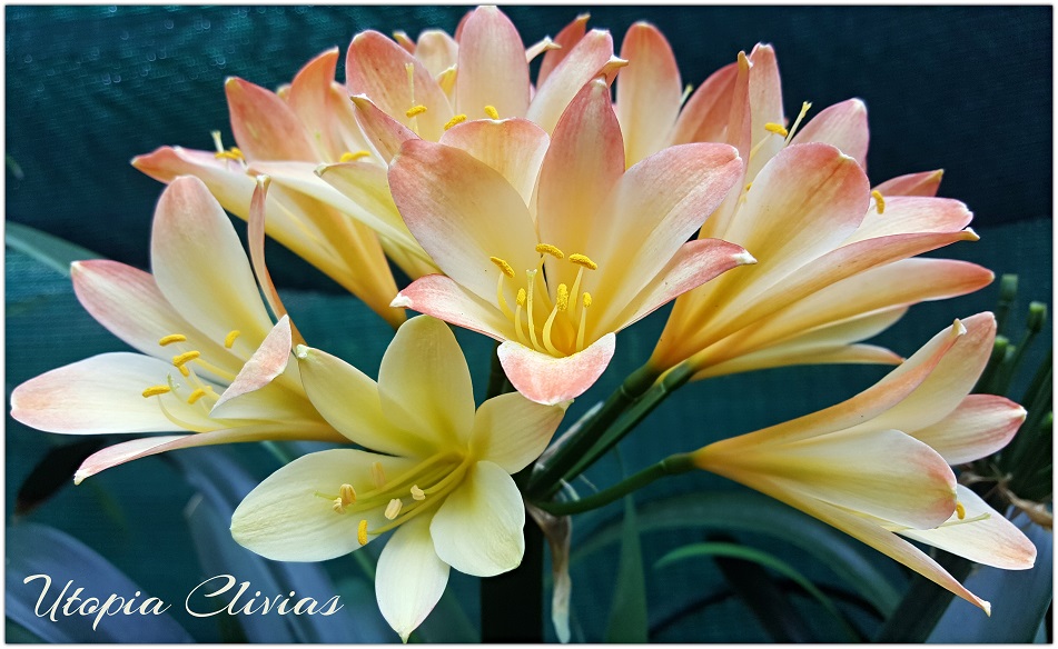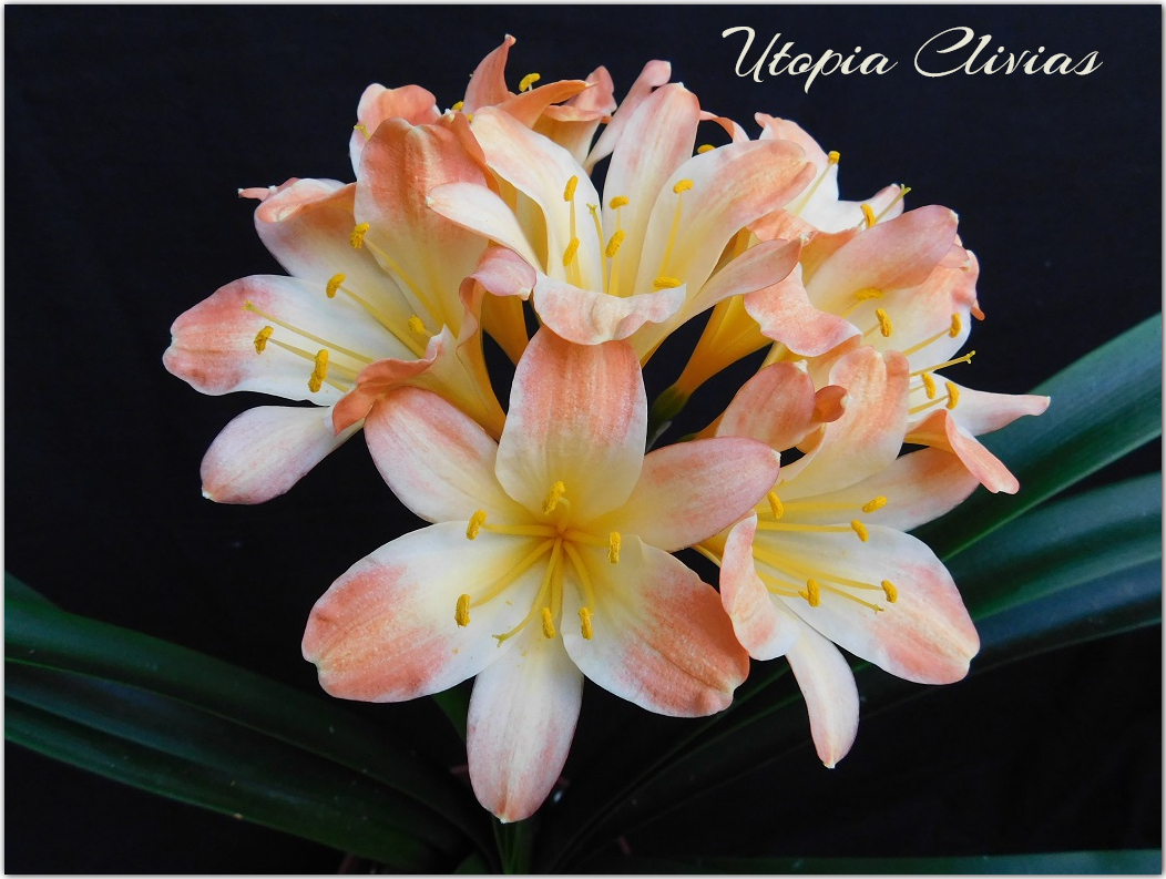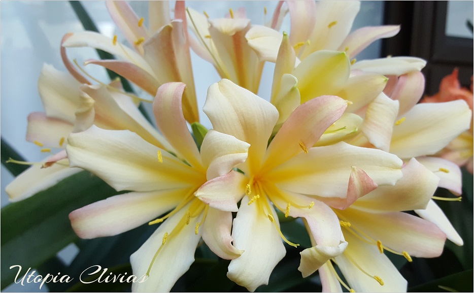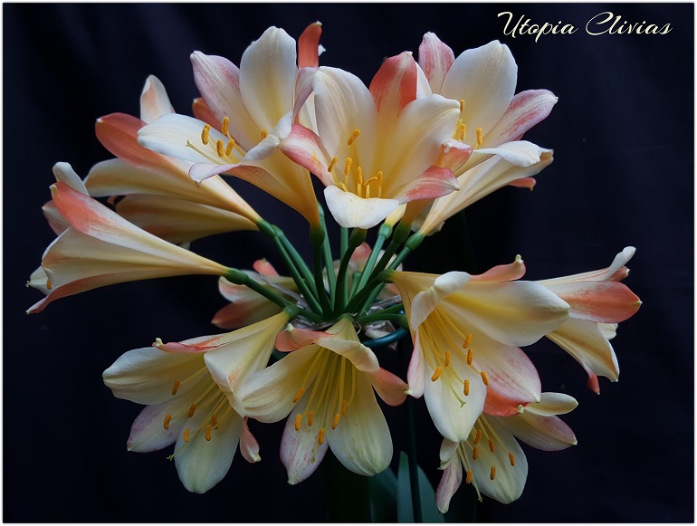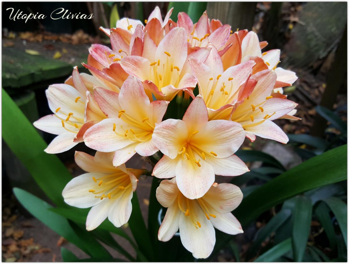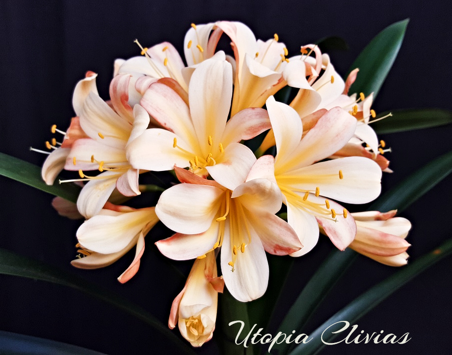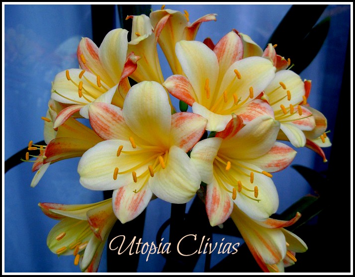 Lynn Janish Parfait - Registered Cultivar: This selection was made by Lyn Janisch in KZN. The plant was found in her garden amongst the orange Clivia miniata. It produces a full umbel of yellow flowers that have tints of pink. As the flowers open the pink becomes darker in sufficient light so that the umbel is a mixture of colours, hence the name. There is a small notch in the tip of many petals. It is a good grower that offsets well. Flower count is approx 20 flowers per umbel.