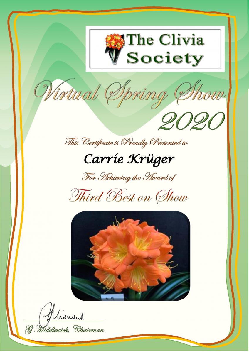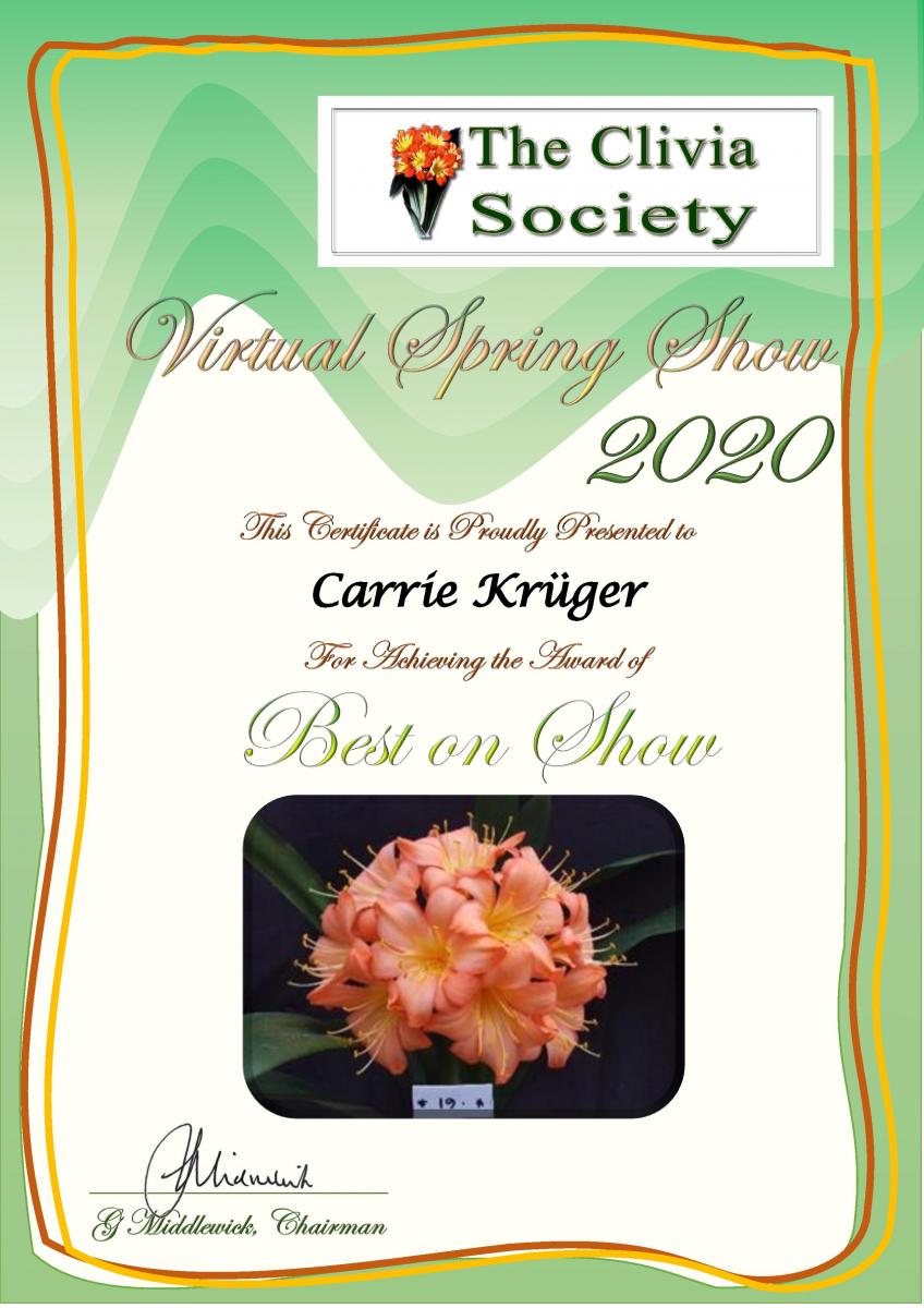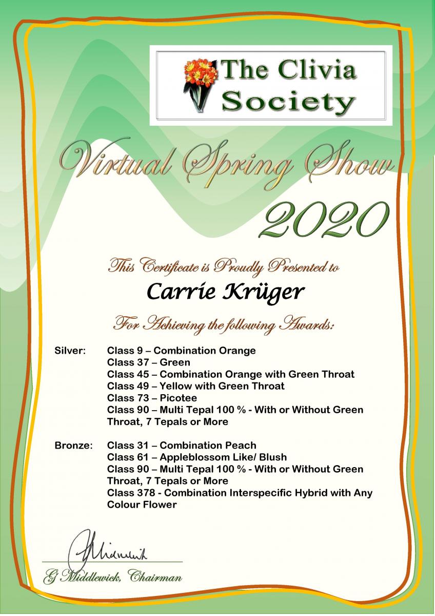Our local prestigious Utopia Clivias proprietor, Carrie Kruger, has once again walked off with armloads full of awards for her spectacular plants and flowers. This year, unlike previous years where the competitions were live and attended world wide, all the clivia shows of 2020 were cancelled. Not to be deterred the clubs and the International Society agreed upon hosting virtual shows for members to still be able to display and show off their beautiful Clivias. For the virtual shows the competitors had a certain time limit to take photos of their best blooms, whilst they were in the prime of their flowering season, and display them online for judging.